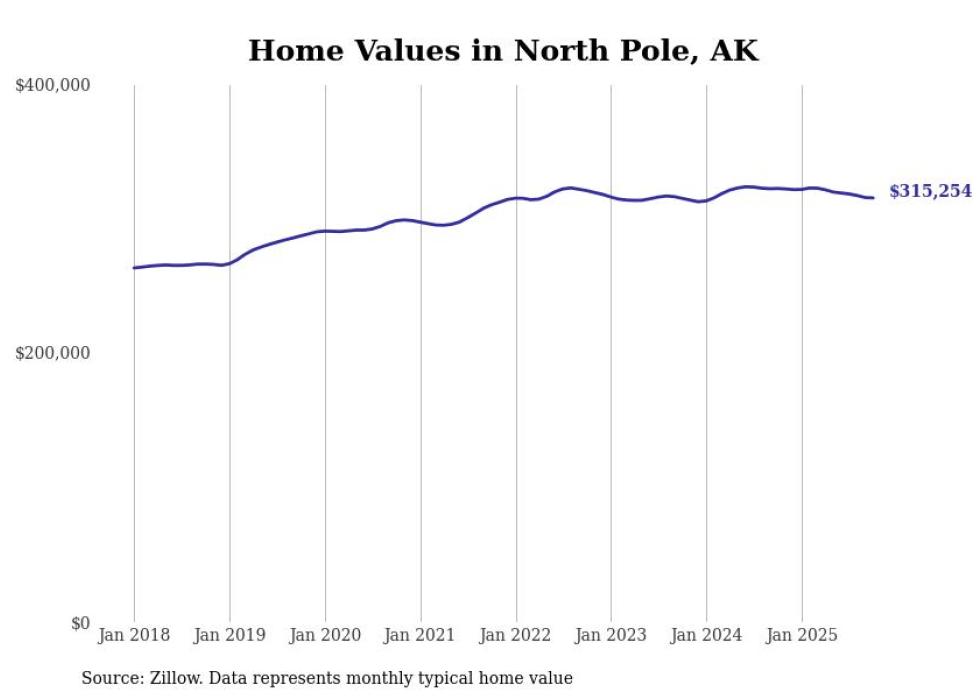 Cities with the fastest-growing home prices in the Fairbanks metro area Stacker Fairbanks, AK News Stacker - 1-year price change: -$18,765 (-9.1%)- 5-year price change: $-15,098 (-7.5%)- Typical home value: $186,626 (#3 most expensive city in metro) #3. Salcha, AK No Automated Backlink Off Stacker - 1-year price change: -$8,508 (-2.9%)- 5-year price change: +$12,243 (+4.5%)- Typical home value: $285,515 (#2 most expensive city in metro) #2. Fairbanks, AK No Automated Backlink Off Stacker - 1-year price change: -$7,004 (-2.2%)- 5-year price change: +$16,933 (+5.7%)- Typical home value: $315,254 (#1 most expensive city in metro) #1. North Pole, AK No Automated Backlink Off ungvar // Shutterstock