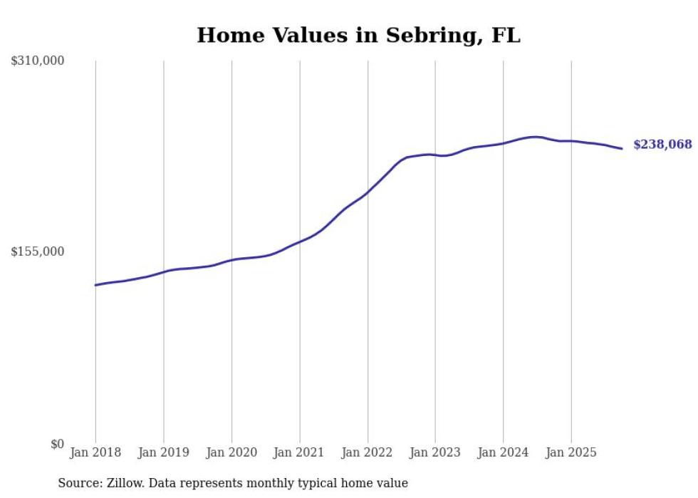 Cities with the fastest-growing home prices in the Sebring metro area Stacker Sebring, FL News Stacker - 1-year price change: -$8,910 (-3.4%)- 5-year price change: +$85,398 (+50.8%)- Typical home value: $253,584 (#2 most expensive city in metro) #5. Lorida, FL No Automated Backlink Off Stacker - 1-year price change: -$7,915 (-3.7%)- 5-year price change: +$74,668 (+56.8%)- Typical home value: $206,108 (#5 most expensive city in metro) #4. Avon Park, FL No Automated Backlink Off Stacker - 1-year price change: -$6,903 (-2.8%)- 5-year price change: +$81,990 (+52.5%)- Typical home value: $238,068 (#3 most expensive city in metro) #3. Sebring, FL No Automated Backlink Off Stacker - 1-year price change: -$6,293 (-2.6%)- 5-year price change: +$85,131 (+55.8%)- Typical home value: $237,754 (#4 most expensive city in metro) #2. Lake Placid, FL No Automated Backlink Off Stacker - 1-year price change: -$3,598 (-1.0%)- 5-year price change: +$129,302 (+59.2%)- Typical home value: $347,749 (#1 most expensive city in metro) #1. Venus, FL Highest-rated fine dining restaurants in the Sebring area by diners No Automated Backlink Off FOTOGRIN // Shutterstock