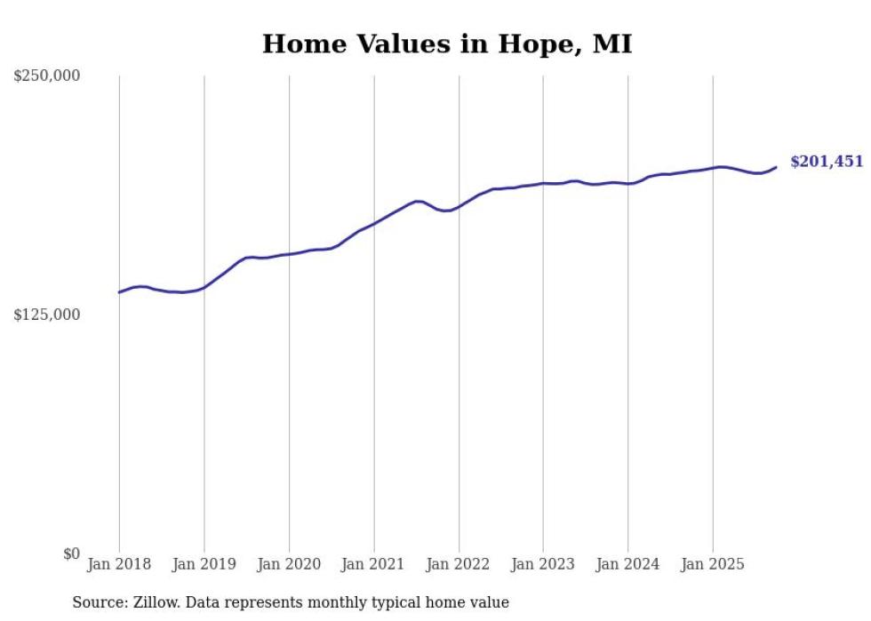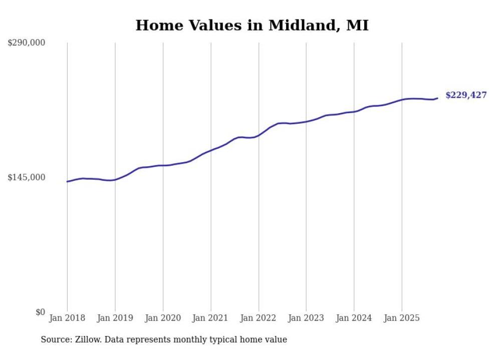 Cities with the fastest-growing home prices in the Midland, Michigan metro area Stacker Midland, MI News Stacker - 1-year price change: +$1,930 (+1.0%)- 5-year price change: +$35,690 (+21.5%)- Typical home value: $201,451 (#3 most expensive city in metro) #4. Hope, MI No Automated Backlink Off Stacker - 1-year price change: +$3,983 (+2.2%)- 5-year price change: +$53,853 (+41.2%)- Typical home value: $184,430 (#4 most expensive city in metro) #3. Coleman, MI No Automated Backlink Off Stacker - 1-year price change: +$4,287 (+2.1%)- 5-year price change: +$51,499 (+33.3%)- Typical home value: $205,942 (#2 most expensive city in metro) #2. Sanford, MI No Automated Backlink Off Stacker - 1-year price change: +$5,582 (+2.5%)- 5-year price change: +$62,630 (+37.5%)- Typical home value: $229,427 (#1 most expensive city in metro) #1. Midland, MI No Automated Backlink Off FOTOGRIN // Shutterstock