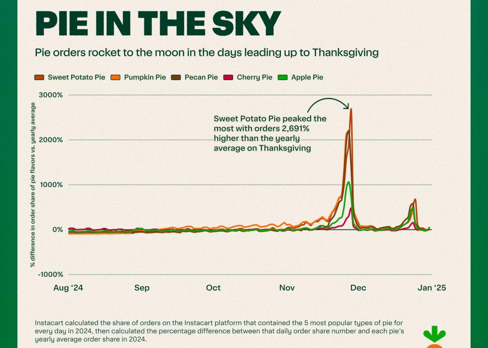 Instacart data also reveals that sweet potato, pumpkin, and pecan pies saw the most dramatic surges, while apple pie rose more gradually throughout fall, and cherry pie also saw a small but sweet uptick around Turkey Day.